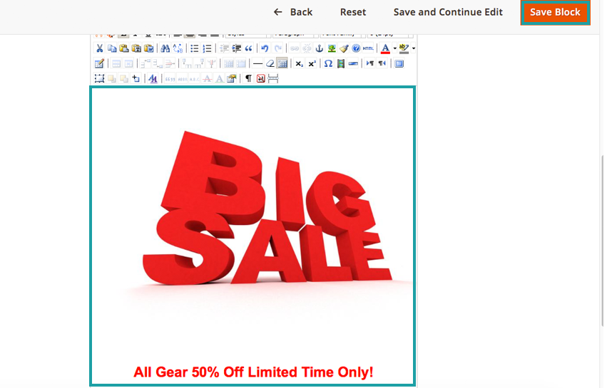 Creating a new static block can be done through the backend administrative dashboard. In the following steps we will be creating a new CMS Static Block that contains a banner to advertise a sale. However you could follow the steps and insert any sort of content you want to appear on your page into your block.