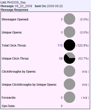 FYI, here’s an example of a text-only email (no message open tracking, but we can track clickthroughs) that received a 120% clickthrough rate.
