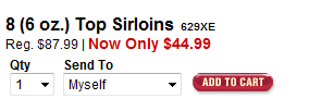 They give the list price at the top, but have a line striking through the price, so you know this isn’t the actual price. Next, they give you what you’ll save ($10.00), and also translate that into a percentage (28%). 28% seems like a big discount, but $10 off on a $34.99 purchase seems even more compelling. Finally, they list the sale price below. It’s quick, fast and easy to understand how much you’ll save and what you’ll pay. Omaha Steaks Example: Here’s how Omaha Steaks displays their discounts: