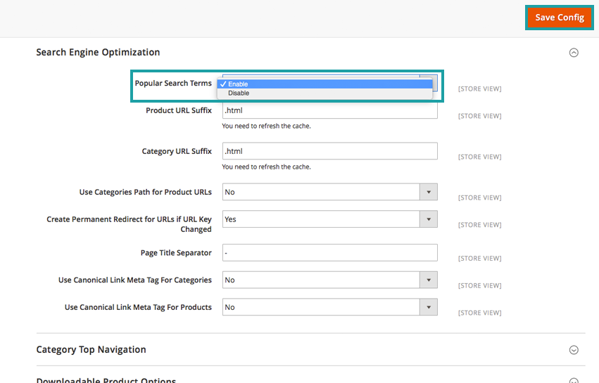 Change the dropdown for “Popular Search Terms” to “Enable” and then click “Save Config”