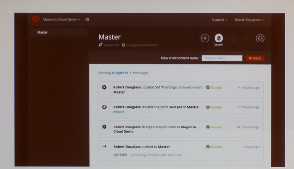 This is a view of the "Master" branch in the Magento Enterprise Cloud Edition, where you can see the git commits of the developers working on the system. It’s easy to roll back, too, if someone messed something up.