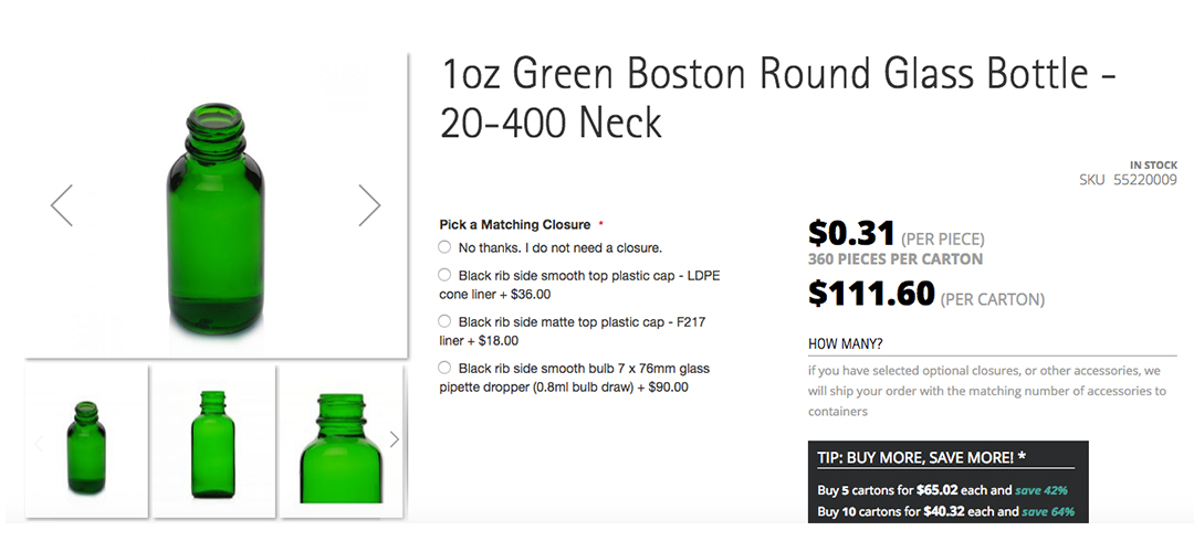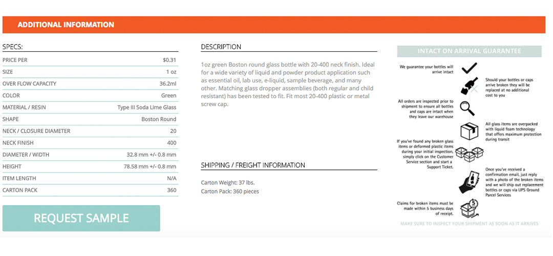 We built out an improved left sidebar for filtering capability on category pages. This new filter is an improved design for the new site and allows customers an easy way to drill down to specifics of what they are looking for – whether it be bottle shape, color, or fill capacity. The new left sidebar is also integrated with the search results pages so that it is seamless design/functionality across the category and search results pages.