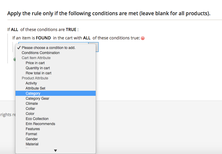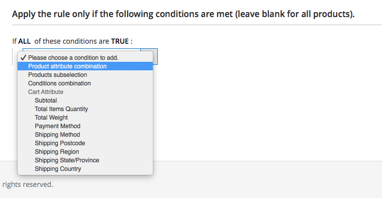 A drop-down menu will appear for you to choose which conditions you want to your pricing rule to apply to – in this case we are going to choose “Product Attribute Combination”