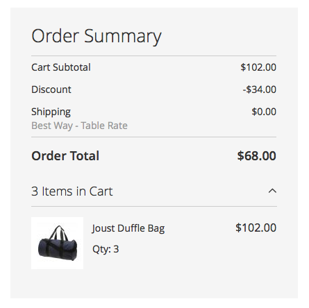 I set my promotion to run for the bags category – if the customer buys two bags they get a third bag for free. The customer will need to put three bags into their cart to receive this deal. It will look like this when the customer to checks out: