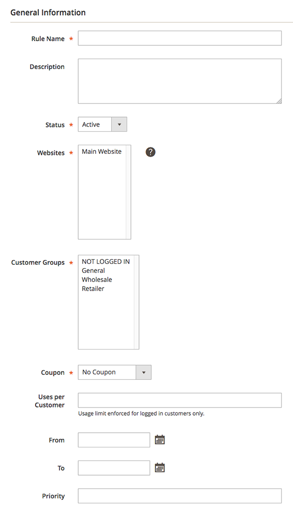 • Uses Per Customer: How many times the coupon or promotion can be used (applied to logged in customers only)