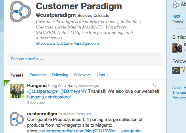 Are you on Twitter? If yes, follow us @custparadigm. We’re tweeting about the latest sites we’ve launched, re-tweeting Magento news and tips worth an RT, and sharing notes from our own knowledge base of Magento eCommerce platfrom, WordPress, email marketing and 9 years of online marketing successes. Our feed wouldn’t be complete without OH’ing the PC things Ben says and posting the videos of our own Thaddeus Lamar Barber as he waxes athsmatic on all things pure geek. Today we got a sweet tweet that made us blush from our friends at the couture bag company, Hung On U: