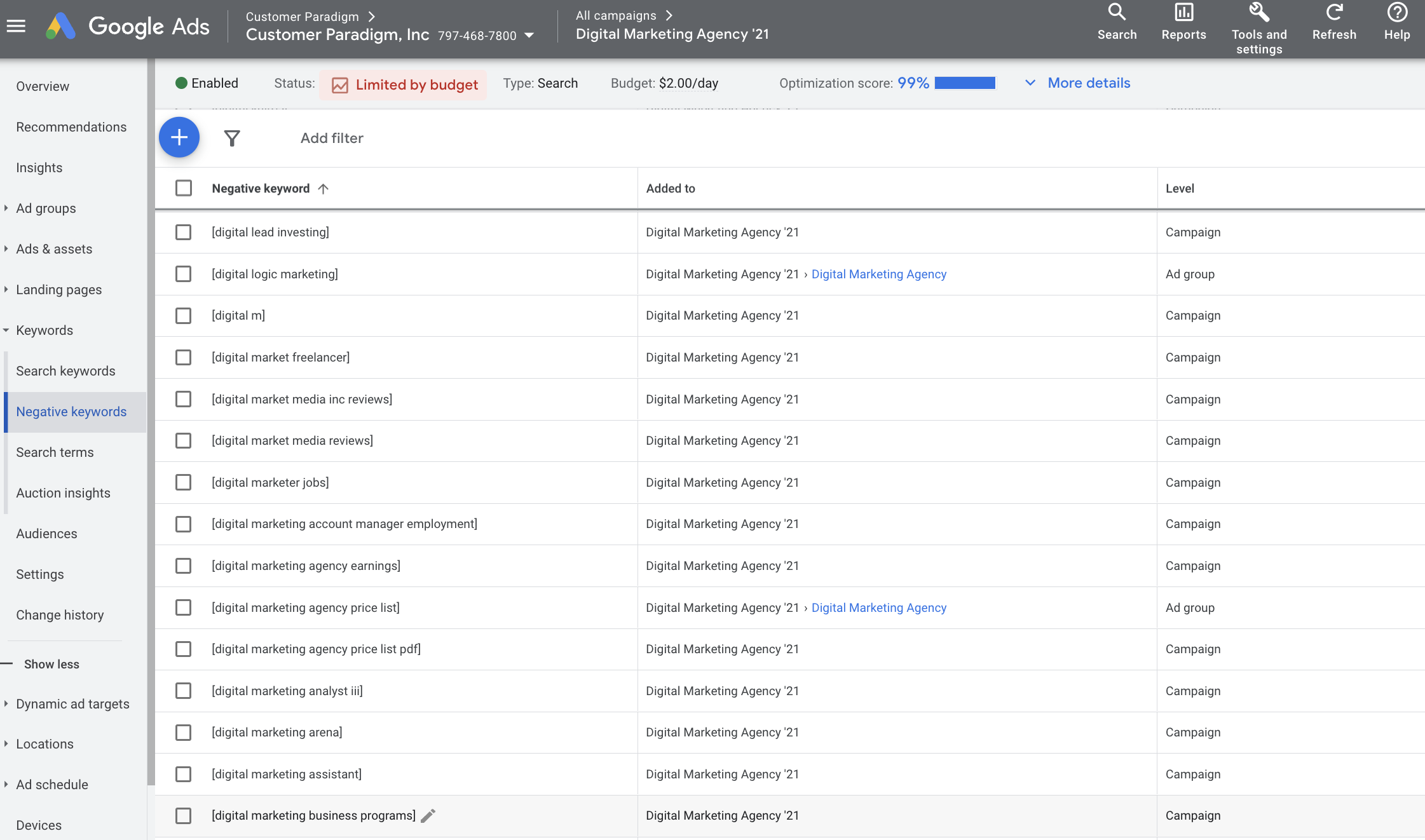 I don’t have a list of negative keywords we use for every campaign, because everything is different. But often the words “free”, “discount”, “tutorial”, “how to” or “DIY” can be part of your campaign. I’m not sure if you’re part of the “I want to hire a professional” or “I’m a DIY person looking for advice” with digital marketing and advertising.