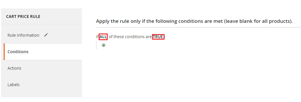 - A line will appear that says, “If an item is FOUND in the cart with ALLof these conditions true:” (NOTE: You can click FOUND and ALL to change these specifications)