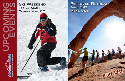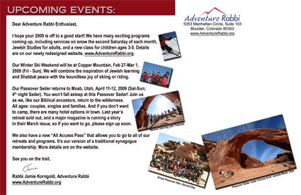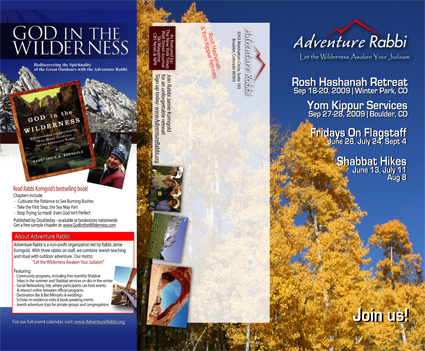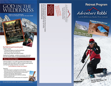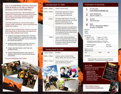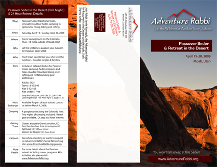 Above is a custom-designed tri-fold brochure for Adventure Rabbi’s Passover in Moab retreat. A tri-fold design like this allows you to fold it over and mail it, using the space in the middle for the return address, stamp and mailing address.