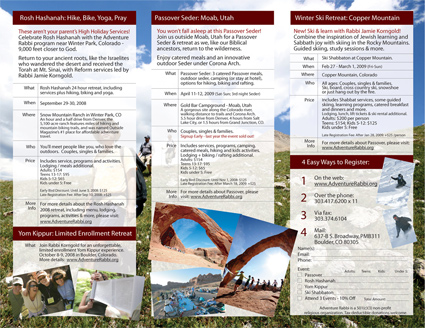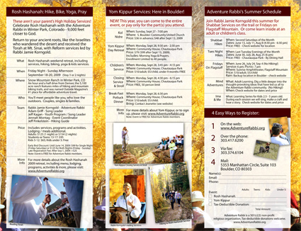 Below is the inside layout of the tri-fold brochure, designed by Customer Paradigm in Boulder, Colorado. The inside of the tri-fold features the Rosh Hashanah Retreat, Passover in Moab and a Winter Ski Retreat, and includes a mini-registration form.