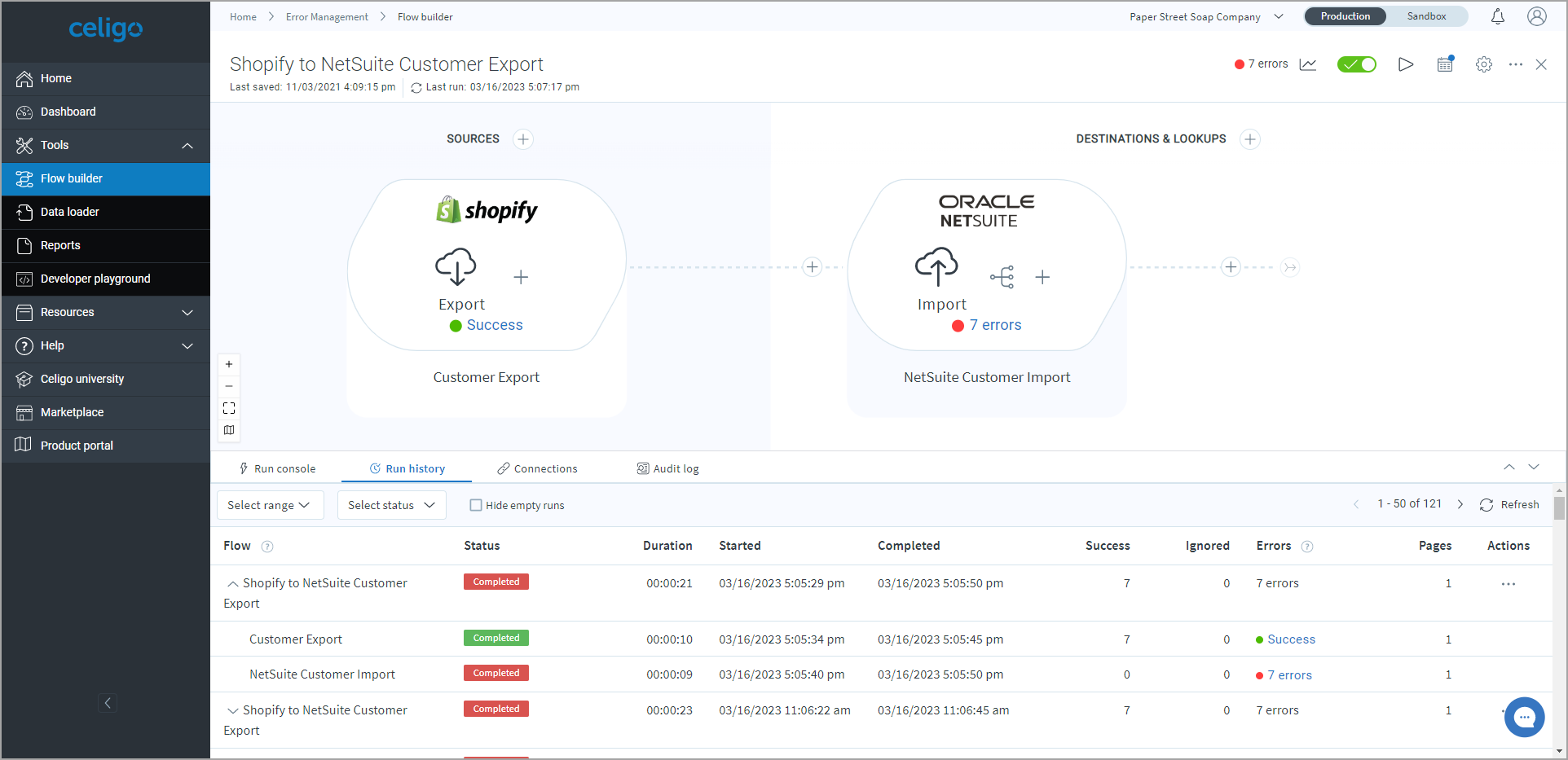 Even though it’s best to avoid them, sometimes errors can occur when you run flows. When this happens, in addition to the flow itself, there are two places in the Celigo integrator.io that notify you of the errors.