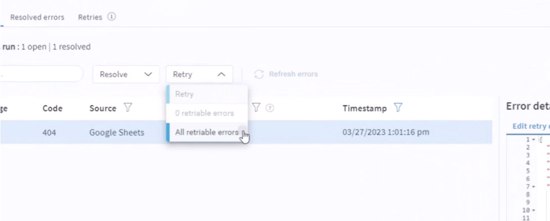 You can then retry the errors or mark the error as resolved and rerun the flow.