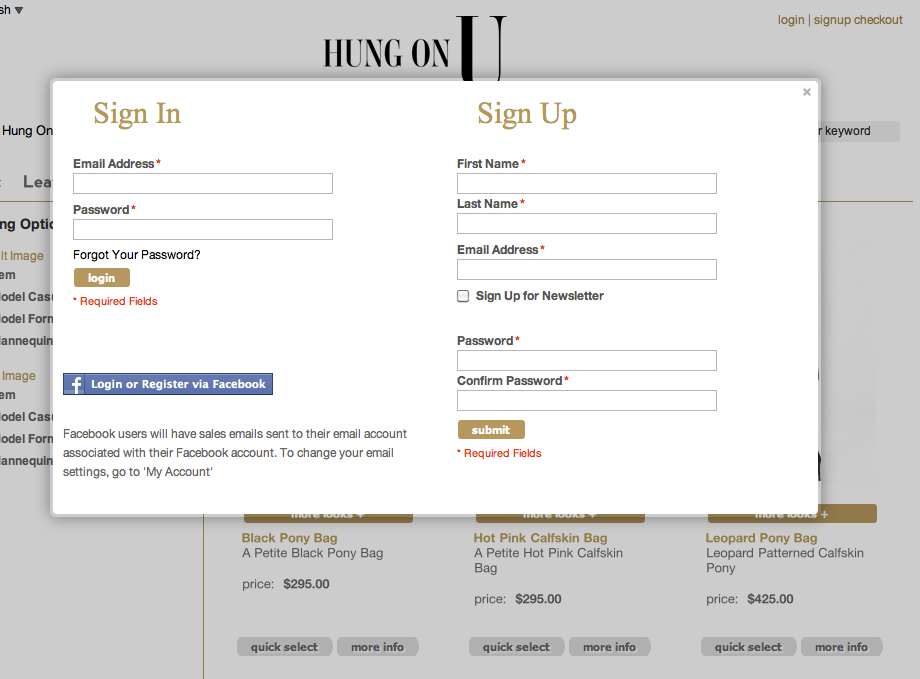 In July, we launched the new Hung On U Magento eCommerce site with a full load of special features and customizations. Here are the details of the project and the Magento customizations we did for them. About the Company: Founded by supermodel Patti Hansen, Molly Madden, and Debi Koppel, Hung On U offers designer bags in exotic and casual materials that celebrates the unbridled spirit of artistic expression fused with authentic rock’n roll chic. They have a wordpress site – www.hungonu.com – and wanted to integrate it with a Magento store. The Design: We applied their design PSD’s to a modified HelloSexy theme from HelloThemes, and made a custom image slider on the home page. The Custom Features: