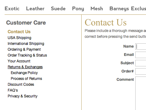 2. On the Contact Us page, we installed a custom customer support page complete with a freshly built javascript menu.