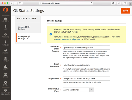 Customization Available. If you have special requirements for how you would like the Magento 2 Git Status Extension to work with your site, please let us know. We can modify the extension to meet your business needs. For example, perhaps you want only a specific person to be notified if a specific file changes. We can do this, but for user experience reasons, these features were not included in this extension. Please contact us >>