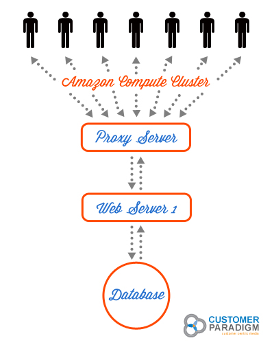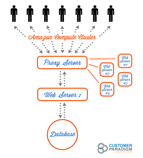 For normal usage of the site, the system will rely on the Proxy Server, Web Server and Database Server for all needs. High Capacity “Burst” Amazon Compute Cluster: During periods of high volume / demand, especially during an auction, the system will automatically “spin up” additional Web servers to handle the additional capacity. The additional Web servers are priced at just $0.68 per hour for a High CPU Extra Large Instance; running 10 would by only $6.80 additional during peak load times. In this case, the system will rely on the Proxy Server, multiple on-demand Web Servers and Database Server for all needs. Here’s a view of how the high-volume, dynamic Webserver spin up architecture works for a Magento site:                                         Click Here to View Burst Cluster Architecture for Magento eCommerce Servers >>