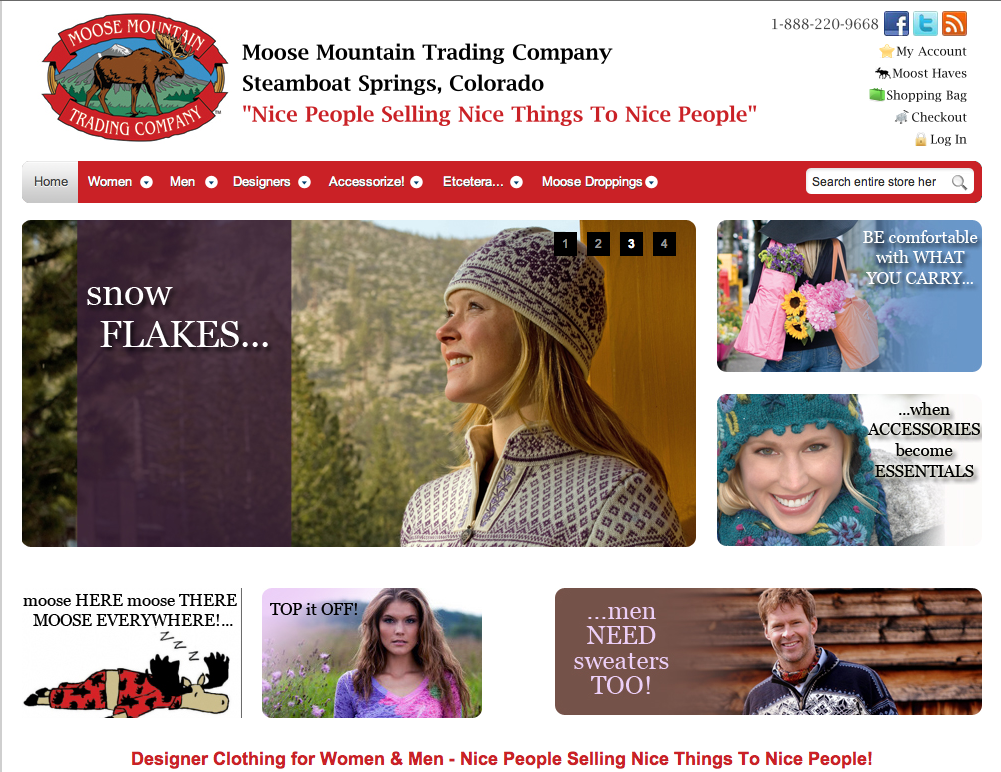 Moose Mountain Trading Company calls Steamboat Springs, CO home-sweet-home, but their retail reach online is global. (The retail shop is the most fun store in Steamboat’s in the busiest block of downtown.) They offer a carefully choosen collection of quality sweaters from leading designers and brands as well as handpicked essentials for men, women and children. They came to us wanting to upgrade their old eCommerce system to Magento 1.5 so they could take their online shop to the next level (or two!). Magento was installed on Nexcess hosting, and we used the HelloSimple theme as a template for the store with modifications to the templates. The company culture comes through on the site – fun products to have, amazing quality lines, and stellar customer service.