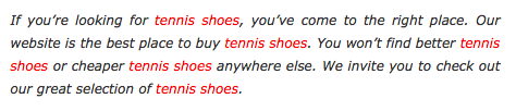 This is a fair question, and one that we often get when we offer Content Creation services as a part of a complete On-Site Optimization package. The reason is most succinctly explained below; it is an example of what some SEO Professionals still advertise as search-engine optimized content. While it is correct that keyword usage within content is important for rankings, this is an example of what we call Keyword Stuffing, and as of August 2011, has been rendered completely obsolete. Back before search engine algorithms were more sophisticated, there was less information that could be crawled by the spiders that visited your site.