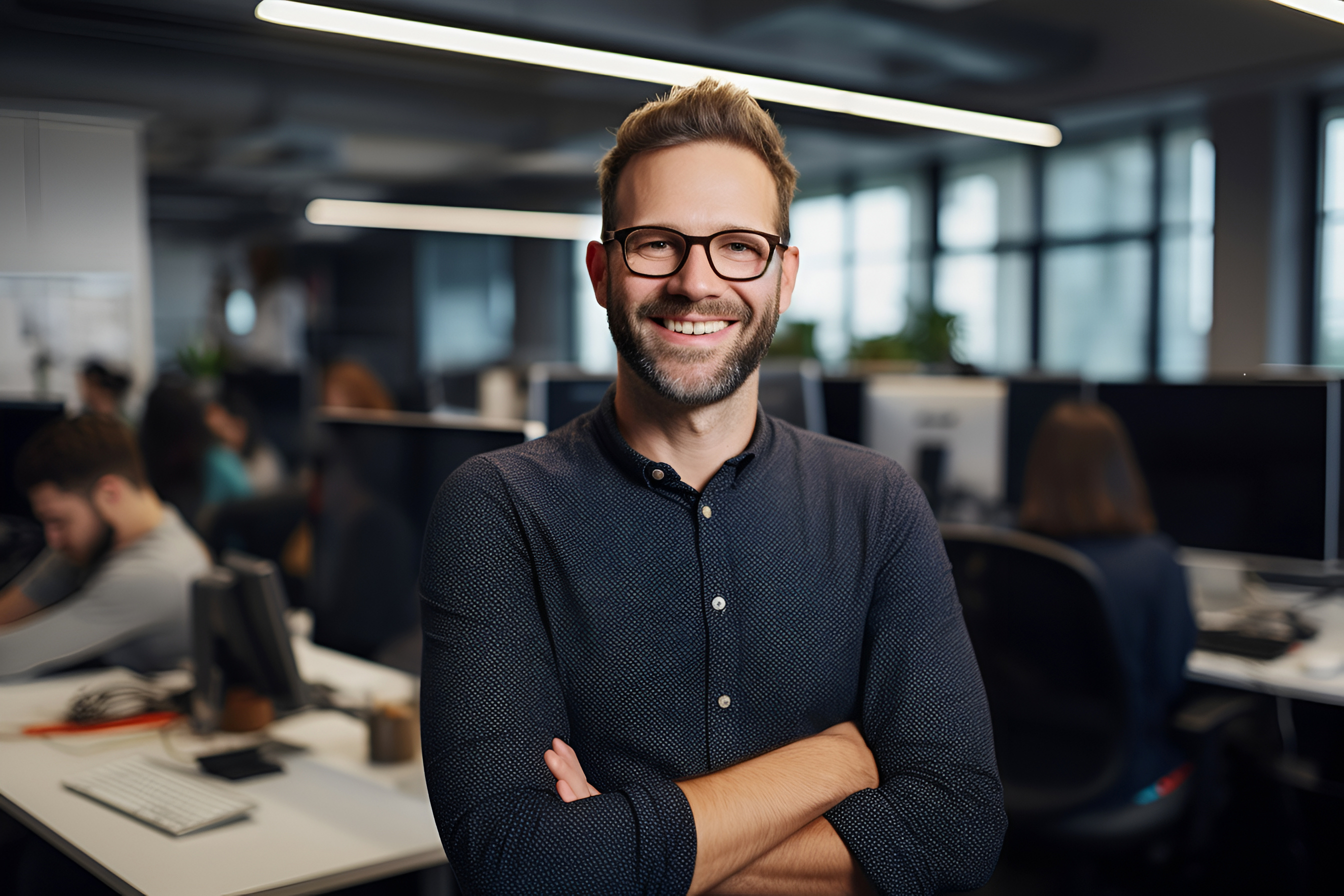 Smiling German Businessman Standing With His Arms Crossed in a Modern Office by Fanny Salstein | Oct 26, 2023