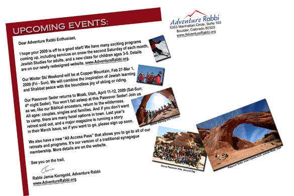 The back also has a series of smaller photos that attempt to connect with the recipient on an emotional level, and cause them to visit the website to sign up for the Ski Retreat or Passover Seder in the Desert. Here’s the back: